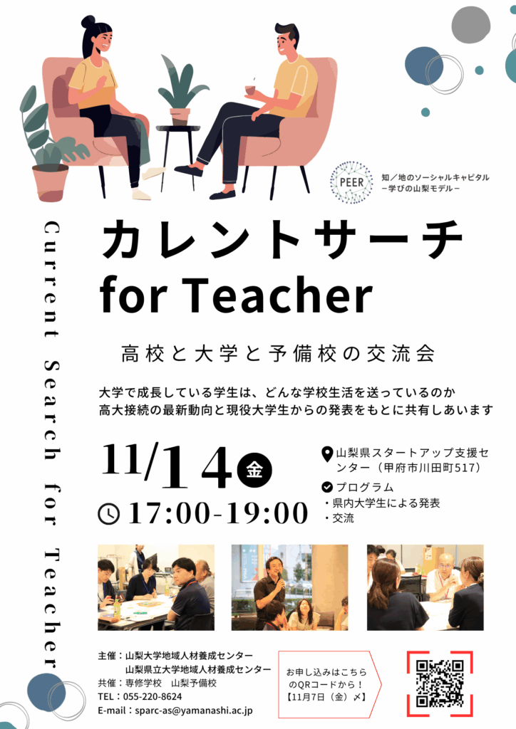 山梨大学地域人材養成センターでは、県内の高校教諭と大学教員、専修学校山梨予備校の教員による交流イベント、「第4回カレントサーチ for Teacher」を開催いたします。